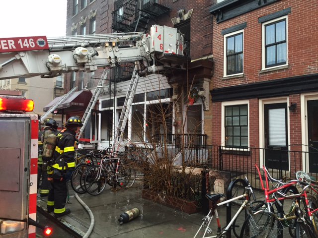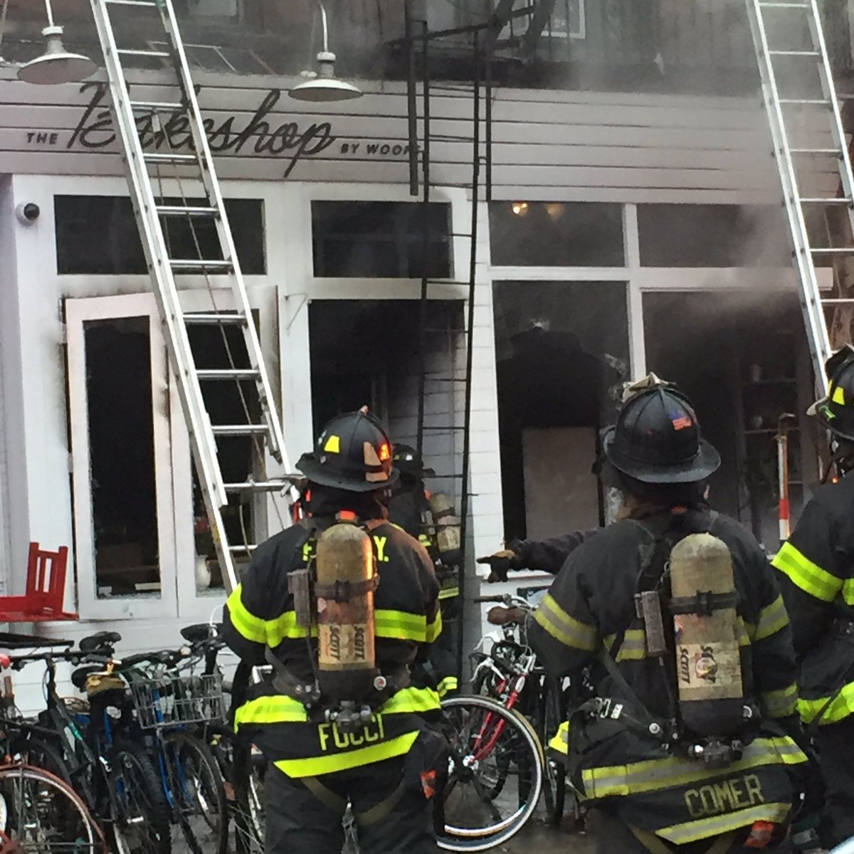 Passerby Chris Dulgerian tells us "heavy smoke was coming out of the Woops Bakeshop and the apartment right above it" when he passed by the scene at 7:15 a.m. "Ladders were up to the roof of the building and I could see FDNY helping several residents down the fire escape. About 15 minutes later, FDNY started breaking out the windows to the front of the bakeshop and the apartment above it."